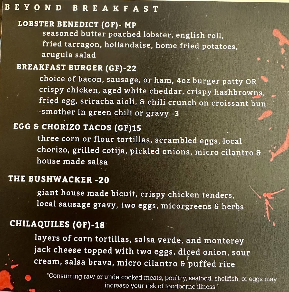 choice of bacon, sausage, or ham, 4oz burger patty OR crispy chicken, aged white cheddar, crispy hashbrowns, fried egg, sriracha aioli, & chili crunch on croissant bun -smother in green chili or gravy $3